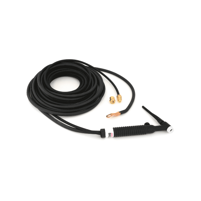 Antorcha TIG-150 12.5″ de 150 A con manguera de 3.8 m, válvula e adaptador de gas. Cabeza flexible para acceso en espacios reducidos; ideal para talleres y mantenimiento industrial continuo.